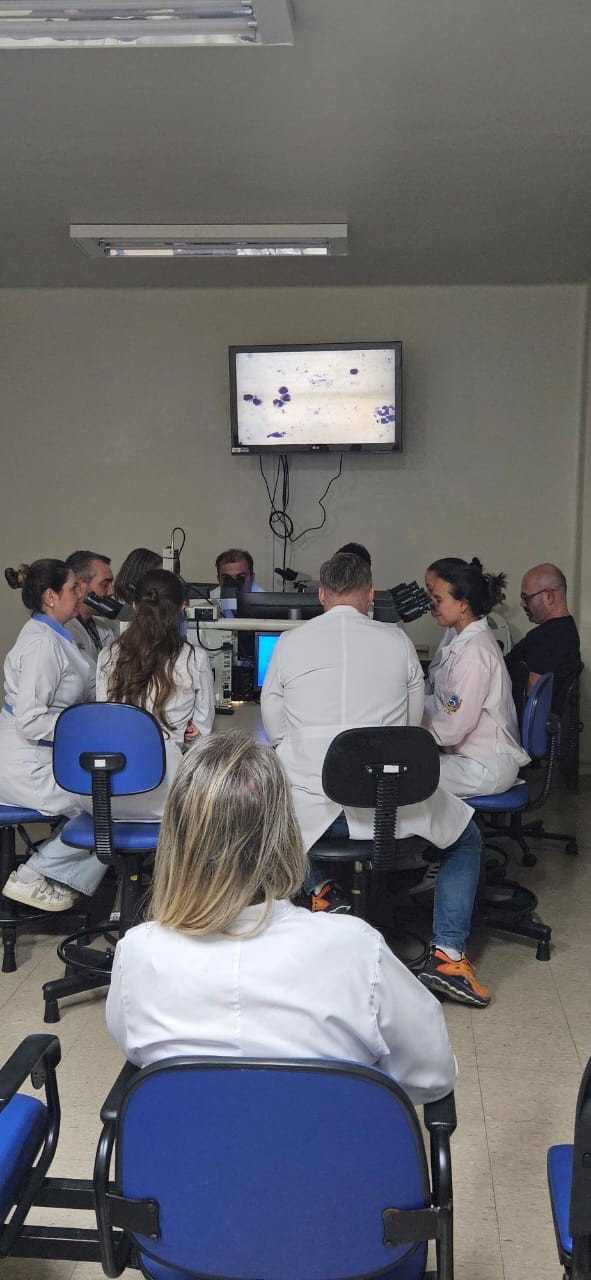 O treinamento incluiu ainda a prática de leitura de lâminas de malária, permitindo o aprimoramento das habilidades técnicas dos participantes e a padronização dos critérios diagnósticos, etapa essencial para a qualidade e a confiabilidade dos resultados laboratoriais.